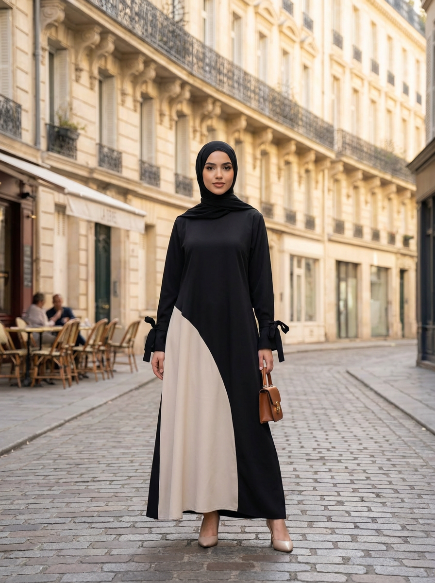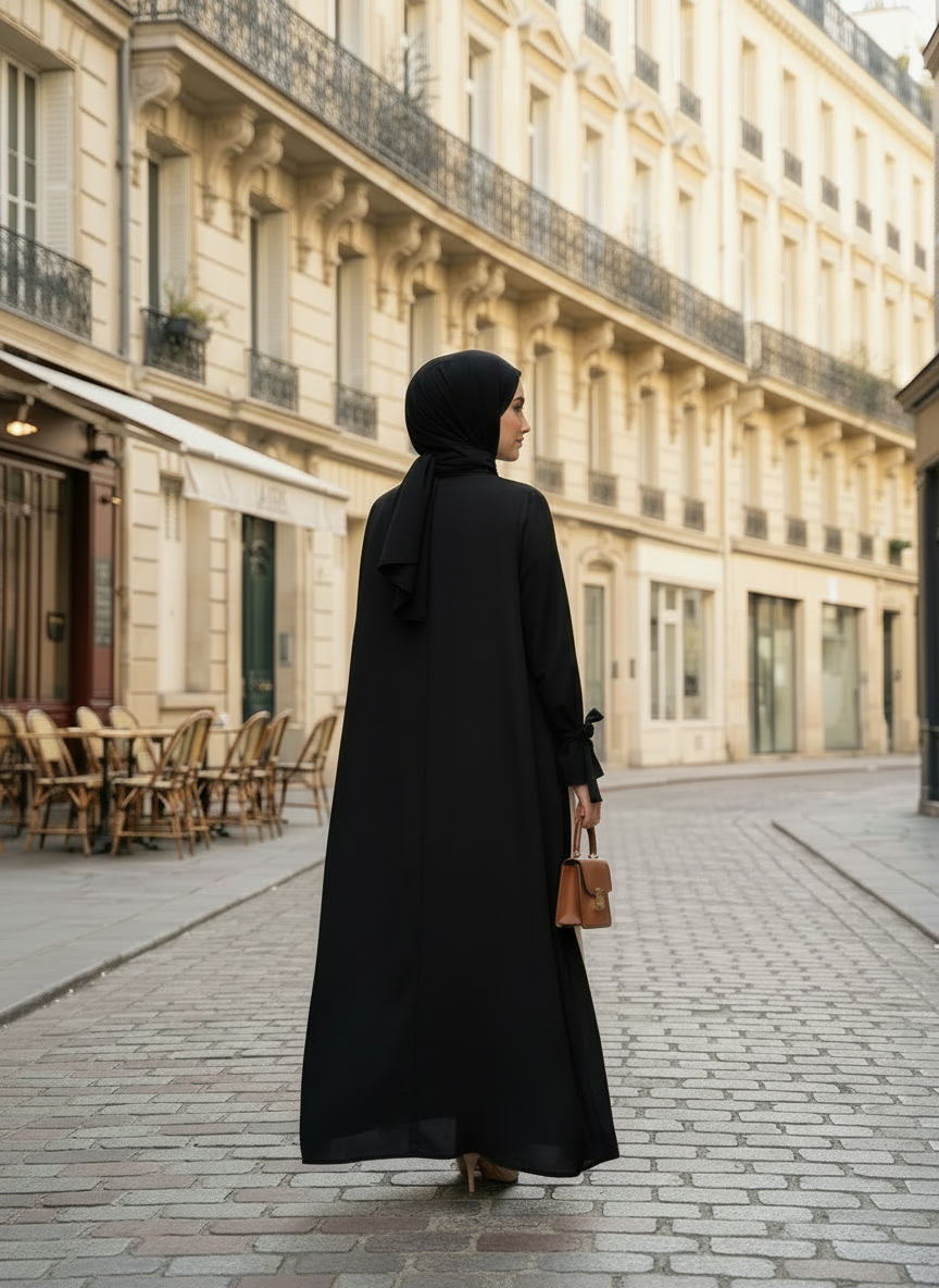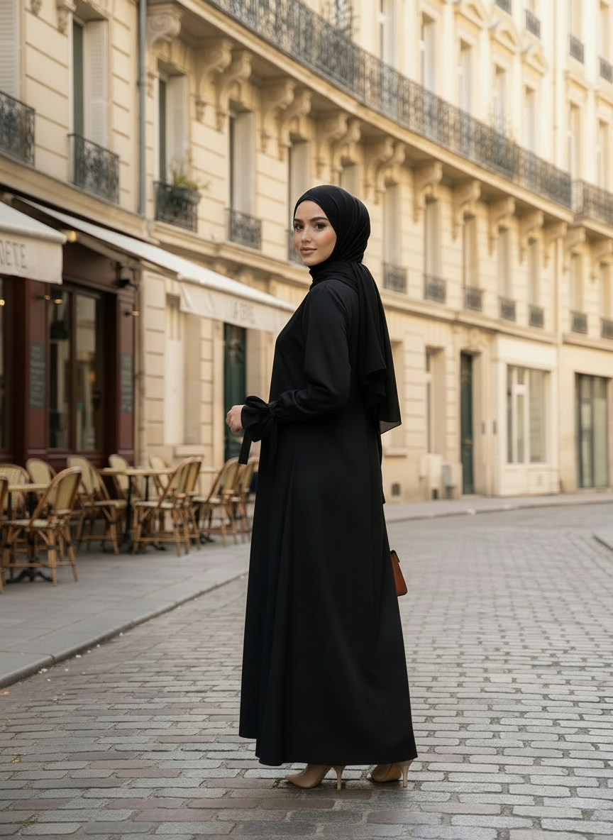 The standout feature is its curved overlay, adding graceful movement and dimension while maintaining a clean, sophisticated finish. Subtle tailoring details bring a touch of femininity and elevate the overall design. Perfect for events, gatherings, or elevated everyday wear, the Noir Curve is a timeless addition to your modest wardrobe.