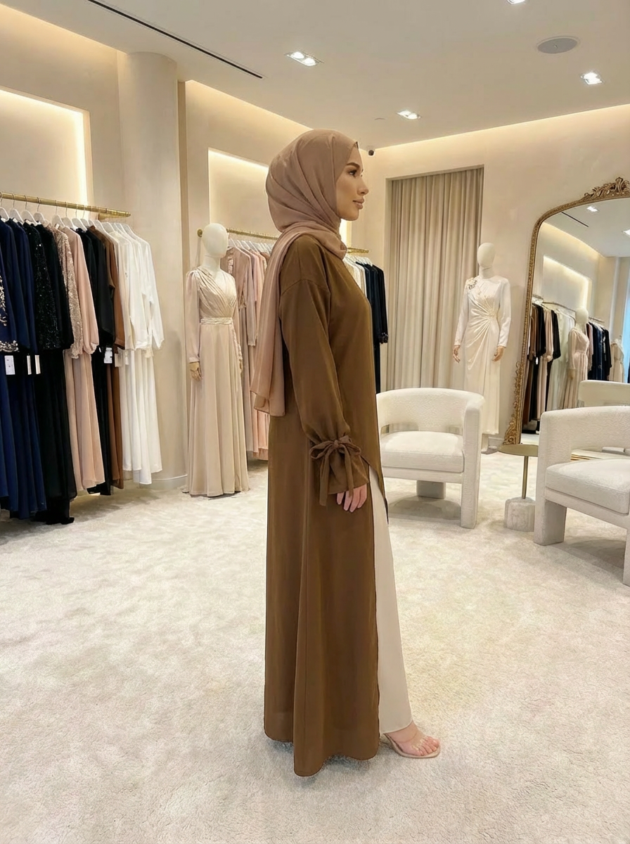 The standout feature is its curved overlay, adding movement and dimension while maintaining a clean, sophisticated finish. Tie-detail sleeves bring a touch of femininity and elevate the overall design. Perfect for events, gatherings, or elevated everyday wear, the Mocha Curve is a timeless addition to your modest wardrobe.