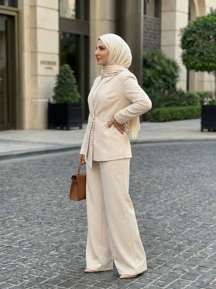 Command attention with timeless sophistication. This tailored two-piece features a structured V-neck blazer with an asymmetric wrap detail and matching wide-leg pants, designed for the modern woman who values both elegance and modesty. Perfect for work, events, or evening outings, the Empire Elegance Suit brings confidence, comfort, and effortless style to your wardrobe.
